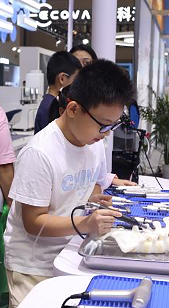 此屆展會分為巡展、專業(yè)觀眾參展、社會公眾參展,為了讓公眾對微創(chuàng)手術(shù)工具有一定了解和認(rèn)識,在西山展廳特別設(shè)置了模擬操作環(huán)節(jié),小市民們紛紛踴躍報名參加。他們稚嫩的小臉蛋上瞪大著雙眼,全神貫注的觀察、聆聽學(xué)習(xí)。實操環(huán)節(jié),在工作人員悉心指導(dǎo)下,小手緊握超聲骨刀手柄,專注凝視著演示物,小心翼翼地切割。西山還通過播放科普動畫、發(fā)放《體貼乳微》科普手冊、演示乳腺微創(chuàng)外科產(chǎn)品技術(shù),向公眾普及乳腺疾病科普知識。